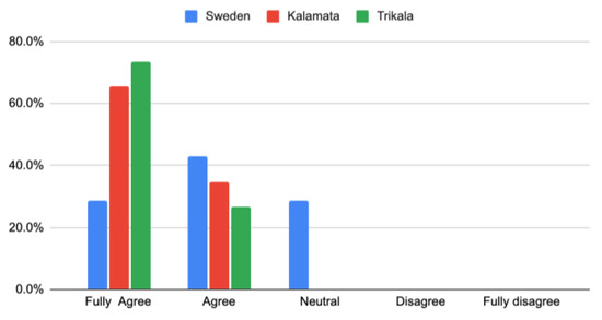 Item 3 asked council members whether they were worried about climate change as shown in Figure 3. After the meeting, there was a 7.4% increase in those who fully agreed/agreed, taking the total to 93.8%. Council members were also influenced by their place of residence. In Kalamata, before the meeting, significantly more members were very worried about climate change (78.3%) compared to Östersund (33.3%) and Trikala (46.7%). Regarding the questions about fossil fuel production and renewable energy, the results differ. While in both Trikala and Östersund, council members became keener on the use of renewable energy (item 5), in Kalamata, though 78.3% originally thought that prioritizing fossil fuel production was important, only 46.2% held the same view after the meeting. However, when asked whether priority should be given to the production of fossil fuels (item 6), in all three municipalities, the results in favor decreased after the meeting. A similar pattern can be seen with regard to the issue of cars using fossil fuels. In Östersund, the Swedish municipality, 83.3% of council members initially agreed that the use of fossil-fueled cars should be phased out, compared to 100% after the meeting. However, for the same question (item 8) in Kalamata and in Trikala, the percentage of those who fully agreed with phasing out fossil-fueled vehicles decreased after the discussion. This change in opinions between councils could be due to the gas pollution present in Östersund, making the reduction of fossil fuels a higher priority for both teenagers and council members living there.