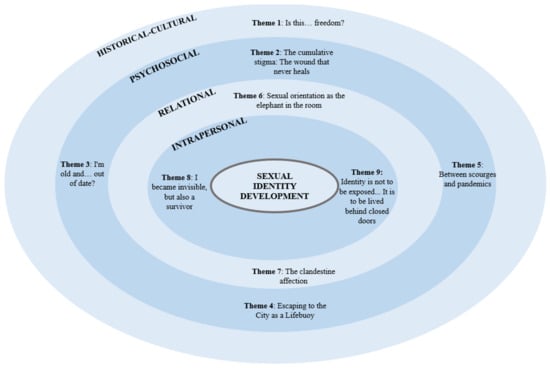 The data were organized according to four major dimensions: the historical–cultural dimension; the psychosocial dimension; the relational dimension; and the intrapersonal dimension. These dimensions correspond to systemic levels of influence on the development of sexual identity, gradually corresponding from more distal levels of influence—macro—to more proximal levels—micro—and were developed in a narrative way with the help of Life Course Theory.