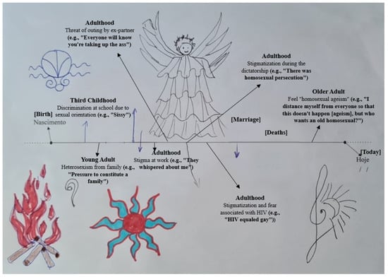 Even in the community, stigmatization continues to occur, as 60-year-old Fábio points out: “And neighbors say, ‘Man, the guy is a faggot… Let’s go and rob his car…’ That’s it. Do you understand? If I’m going to work, I have to hide the car far away because I’m scared!” Arlindo’s lifeline (83 years old) exemplifies this phenomenon of cumulative stigmatization throughout the life cycle (see Figure 2).