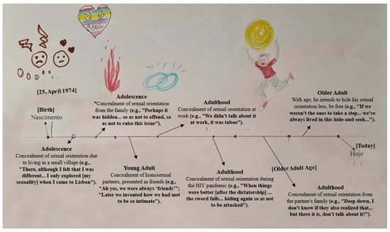 However, the concealment of sexual identity also served as a protective factor at various moments in life, the concealment served as an avoidant and adaptive pattern in the face of the adverse social conditions of the moment: “Look, I was born, my generation was born, in dictatorship, with censorship, with everything that implied. What we learned was… to hide!” (Júlio, 75 years old). Pedro’s lifeline (66 years old) exemplifies this phenomenon of hiding his sexual orientation and avoidance, sometimes as a survival strategy (see Figure 3).