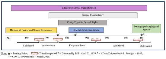The Life Course Theory (LCT) is one of the most appropriate approaches used to assess the complexity of sexual identity development (Elder et al. 2003). This theoretical approach has been widely used with older populations and describes five principles that allow us to systemically evaluate the phenomenon of identity development: (1) human development and aging as a lifelong process, considering that the biopsychosocial and identity development of humans occurs beyond childhood and that situations that occur in adult life are shaped by previous experiences and the meanings associated with them (e.g., situations of sexual stigmatization during aging are shaped by previous experiences of stigmatization); (2) historical time and place, stating that human lives are deeply influenced by socio-historical and cultural contexts, the “where” and “when” people develop influence their entire developmental path (e.g., development during a period of dictatorship in a ultra-conservative context); (3) timing in lives refers to the chronological ordering of events in people’s life cycle and refers to personal and generational times (e.g., adolescence and early adult life of this generation marked by strong sexual repression—generation of sexual liberation); (4) linked lives argues that human lives are lived interdependently, and that relationships (e.g., family, friends, neighbors, colleagues) shape how individuals interpret life events; and (5) human agency indicates that individuals are not passive agents of a predetermined life course, on the contrary, they make active decisions that determine their developmental direction (e.g., deciding to conceal their sexual orientation and isolate themselves from other sexual minority individuals to protect themselves from discrimination). The LCT also indicates that, during the developmental trajectory, people undergo gradual, and sometimes expected, changes to new personal, social and community roles/functions (transitions), as well as they can experience abrupt changes, with a more immediate need for adjustment (turning points). Thus, the personal response to challenges imposed throughout the life cycle are strongly influenced by the five previous principles (Elder et al. 2003; Elder and Shanahan 2006).