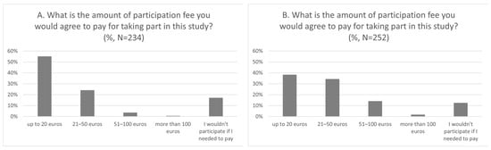 The amount of co-funding participants that were willing to pay for taking part in the (A) Gut microbiome study and (B) My heritage project.