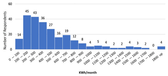 Figure 3 displays the average electricity consumption; this data were obtained from the electricity bill, which all respondents consented to show the team of researchers following the human ethics protocol. Of all households surveyed in the metropolitan area, most respondents consume 100–200 KWh of electricity per month.