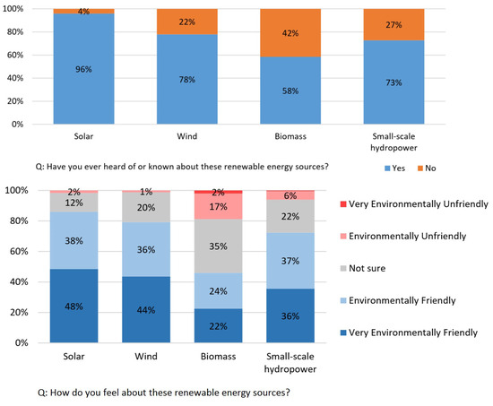 Figure 4 shows that the respondents knew the different types of renewable energy (Solar PV at 96%, Wind Power at 78%, Biomass at 58.4%, and Hydro Power at 72.4%). When considering the eco-friendly feeling of each sort of renewable energy, solar cells had a very eco-friendly feeling at 48.4 percent and wind power at 43.6 percent. For biomass, it was at a not-certain level of eco-friendliness at 36.2 percent. The hydropower was still in the eco-friendly category at 36.8 percent.