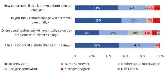 Figure 7 provides insights into the cognitive perception of climate change among respondents. Notably, 51 percent strongly agreed that they hold a high level of concern regarding climate change, while 55 percent believed it would negatively impact their quality of life. This heightened awareness can be attributed to the fact that 52 percent of respondents strongly agreed that they receive substantial news and information about climate change. Additionally, it is noteworthy that 33.6 percent of all respondents held the belief that science and technology will ultimately resolve the climate change issue, albeit at an agreed level. This perspective is likely to drive further interest in Carbon Dioxide Removal (CDR) technology, an emerging field for pollution control in urban areas. It is worth mentioning that the survey instrument included questions pertaining to CDR, and these findings will be subject to future analysis.