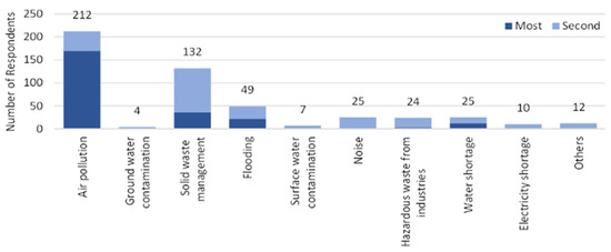 Figure 6 illustrates the primary environmental concern within metropolitan areas. Respondents were asked to vote twice on a list of environmental issues. The top-ranked concern was air pollution, followed by solid waste management as the second most significant environmental issue.