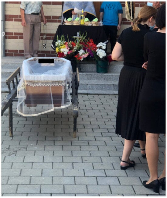 Five traits of Orthodox Christianity have shaped Romanian death culture: 1. A vocation for unmediated community life. The “Living Tradition” (Clémént 2019; Evdokimov 2000; Popovici 2003; Lossky 2017; Meyendorff 2011; Stăniloaie 1969, 1971; Yannars 2011) evokes a Schützian “vivid present”: predecessors, contemporaries, and successors constitute “the we”, sharing a felt presence, a dynamic yet unchanging line of belief (Hervieu-Léger 2000, p. 160); 2. Centrality of the body is emphasised in hesychasm, a crucial psychosomatic practice ensuring the same spiritual path for body and soul (Clémént 1995; Lossky 2022; Ware 1988). Death sacraments also revolve around the body (Figure 2). The Holy Unction for the ill leads to either recovery or to speeding up body/soul separation (Larchet 2001, 2002, 2010; Sfântul Maslu 2022). “Koliva” (a popular cake for funerals and memorials) symbolises the material body longing for the sweetness of redemption; 3. Magic healing practices, although condemned by official teachings, remain crucial in Romanian spirituality (Aghioritul 2003; Candrea [1944] 1999; Cojocaru 1949; Olteanu 1999; Pavelescu 1998); 4. The Romanian Orthodox Church (ROC) opposes suicide and all forms of euthanasia. Following Christ, believers should overcome their fear of physical suffering (Larchet 2010; Lazurca 2022); 5. The ROC’s institutional inertia and complex political past has caused an overall ambivalent attitude towards socio-political change (Makrides 2012; Preda 2011; Rotar 2013, 2021; Stan and Turcescu 2007; Toplean 2018, 2020, 2023; Verdery 1996, 1999). In recent years, the Romanian Patriarchate’s Basilica Press Centre has strengthened, through its many branches, its online presence, making room for pro-modernisation voices often met with hostile resistance by the mass of the faithful. The ROC’s ambivalence has grown to be structural.