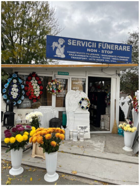 At the Orthodox funerals we observed for documenting the interviews, participants look around for cues knowing they are expected to have skills and motivation for ritual engagement. Some have neutral expressions, staring at the ground; others look embarrassed, fumbling with phones and avoiding eye contact. The biggest online platform for funeral services (condoleante.ro; Accessed on 12 October 2023) provides useful Orthodox guides to funerals. Our informants did not check it. A 33-year-old man explains: “Romania is full of funerary homes and notary offices; no need to look online for death info!” Indeed, almost every flower shop sells funeral arrangements, and every bakery sells “Koliva”. Romanian death culture has an intact, tangible shell (Figure 5).
