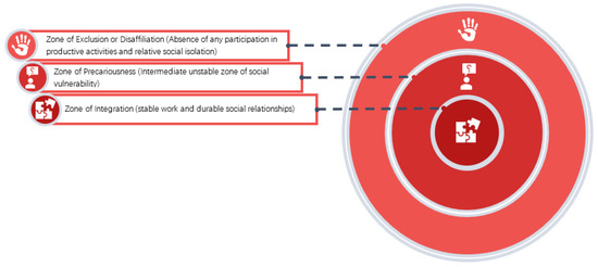Castel (2016) argues that neoliberalism has led to a shift in employment relations characterised by the deregulation of the labour market, the reshaping of any protective schemes, and the development of disconnection (Figure 1). In a figurative sense, the integration zone is characterised by stable social relations and stable employment in the core. An outer shell is characterised by a lack of involvement in productive activities and considerable social isolation. An outer shell is characterised by exclusion or disaffiliation. The precariousness zone is at the middle of this spectrum (Castel 2003).