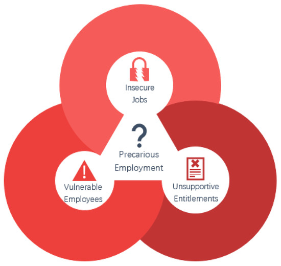 The concept of precarious employment is explicated by Olsthoorn (2014) as a defining characteristic of the employment relationship, i.e., insecure jobs held by vulnerable employees who have limited entitlements to income support when unemployed (Figure 2). In his words, “…precarious employment refers to employment relations that are precarious for the employee, while precarious employees and ‘the precariously employed’ refer to employees in an employment relation that is precarious for them …” (Olsthoorn 2014, p. 424).
