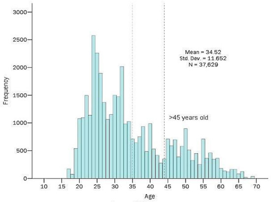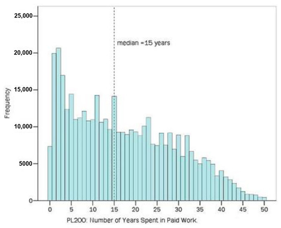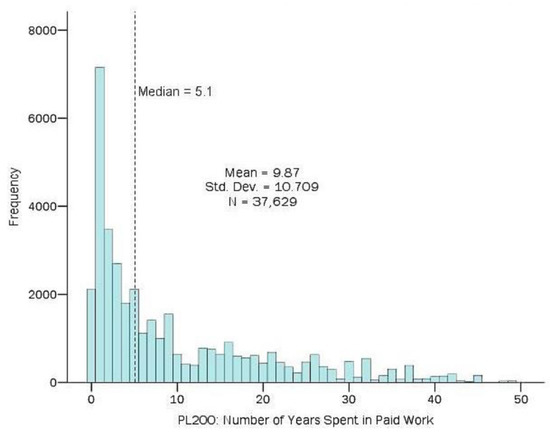 Half of them have worked in paid jobs for more than 15 years, with an average of 18 years. Interestingly, the distribution of precarious workers by duration of professional experience (Figure 4) was quite different; half of them had been employed for less than five years, with the average being 10 years. In the distribution of all employees, the coefficient of variation was 0.7, while the coefficient of variation was 1.1 in the distribution of precarious workers, indicating a concentration of values around the average in this distribution (as can be seen in Figure 5 and Figure 6). Figure 6 indicates the distribution of professional experience among all employees in Cyprus in 2019. The findings suggest that precarious workers accumulated professional experience at a much slower rate than nonprecarious workers (Figure 5, Figure 6 and Figure 7).