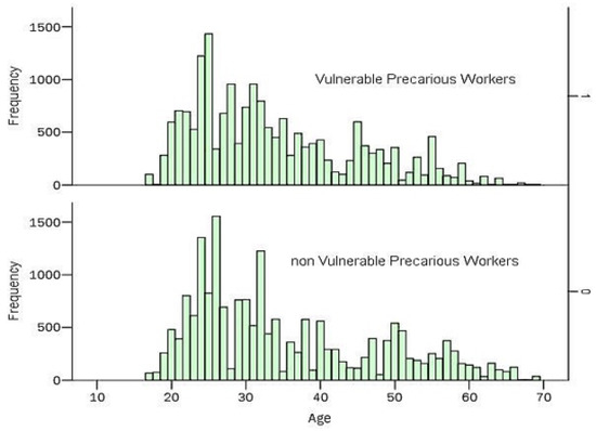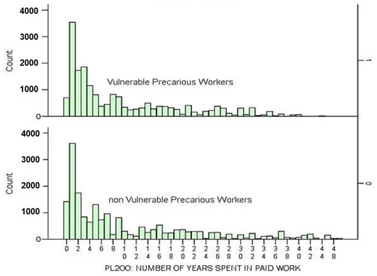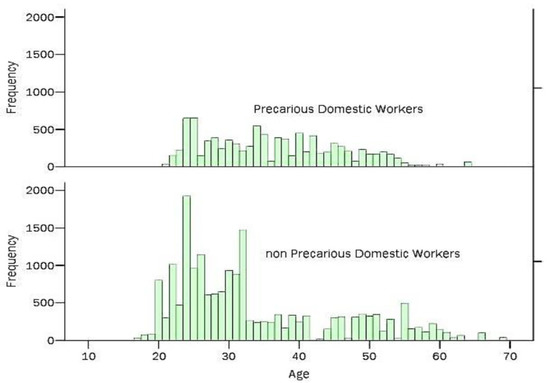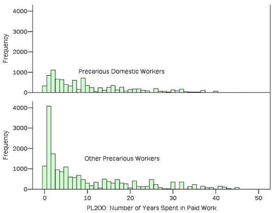In order to address the issue of the overrepresentation of domestic workers within the total number of precarious workers and in order to control for potential bias, the ability to distort the distribution of professional experience was divided. The results confirmed that the findings applied to both domestic and nondomestic precarious workers (see Figure 9).
