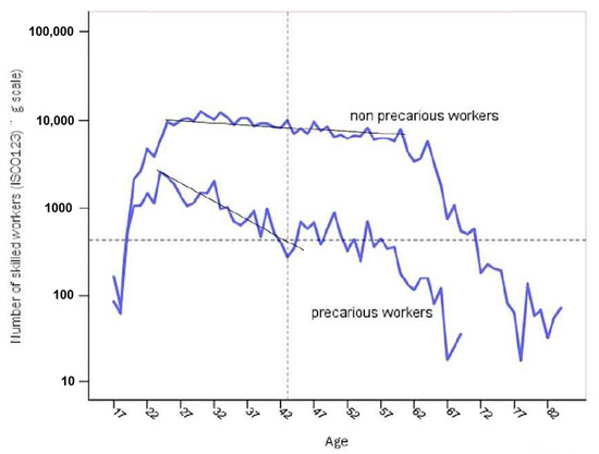 Moreover, the number of skilled workers (ISCO 1, 2, and 3) in the population of precarious workers is lower than in the population of nonprecarious workers. For many precarious skilled workers, especially those who have completed tertiary education, precarious employment is a temporary but prolonged experience. As depicted in Figure 6, the number of skilled precarious workers decreases rapidly between the ages of 25 and 40 years. Skilled labour, however, appears to accumulate professional experience more rapidly. As a result of the factors outlined above, the accumulation of professional experience among precarious workers is low (median = 5.1 years) (Figure 8).