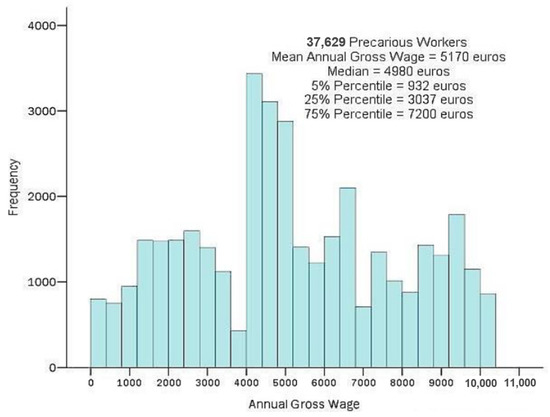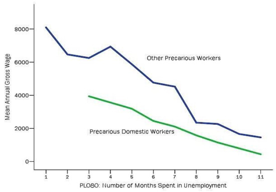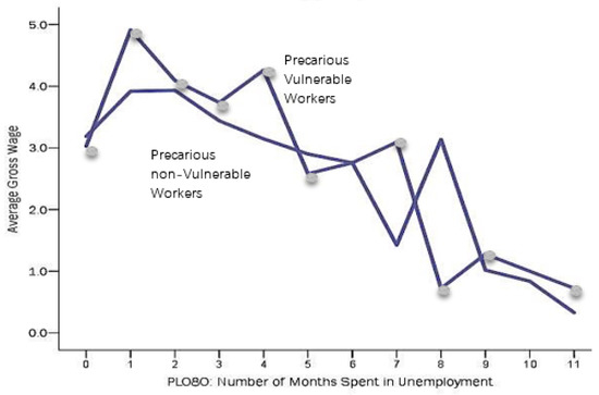 Unemployment at regular intervals tended to be more prevalent among precarious workers compared to nonprecarious workers. Additionally, both unemployment and the number of working hours contributed significantly to the precarious’ low-income levels and continued precariousness. As indicated in the study, precarious workers’ income decreased at a constant rate of EUR 630.00 per month during the duration of their unemployment.