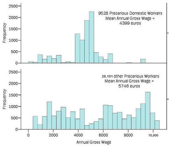 Figure 14 illustrates the internal divisions of precarious domestic workers. Among the 9.528 domestic workers (with no missing values), the average gross annual income is approximately EUR 4400.00. Of these individuals, 5545 had more than five years of professional experience and earned an average gross annual income of EUR 4800.00, while 3983 had less than five years of professional experience and earned an average gross annual income of EUR 3839.00. The income gap between the two groups of domestic workers was approximately 25% of the income of the less experienced.