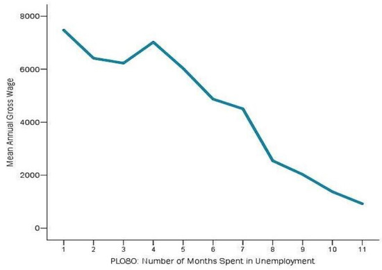 Annual gross wage as a function of duration of unemployment and economic vulnerability. Data source: Eurostat (2020).