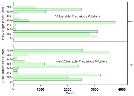 Additionally, it was found that precarious work and economic vulnerability, which are the two components of precarity, were not correlated. This is outlined in a series of figures, of which the most significant ones are presented below (see Figure 17, Figure 18, Figure 19 and Figure 20). The analysis provided in previous sections of this empirical study showed that, in general, the characteristics of precarious workers and their relationship to the labour market were almost identical for vulnerable and nonvulnerable workers, with a few minor differences.