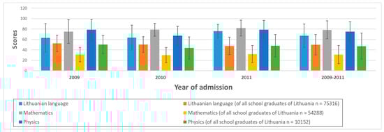 We will first review the graduates’ maturity examination scores. Figure 1 presents the correlations of the assessment scores for the Lithuanian language, mathematics, and physics maturity examinations with the year of admission and their comparison with the examination scores of the general sample of Lithuanian school graduates.