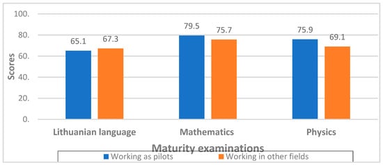 Table 2 shows that the maturity examination results of students who studied aircraft piloting were statistically significantly higher than the national average. The biggest difference was observed in the mathematics maturity examination (Δ = 47.57 points). The students enrolled in the aircraft piloting study program passed the physics examination by Δ = 27.9 points, better than the national average, whereas the smallest difference was noted in the Lithuanian language examination (Δ = 17.29 points). No statistically significant difference was found when comparing the maturity examination scores of students enrolled in the study program in different academic years. Nor could we distinguish statistically significant differences when comparing the maturity examination scores for students who worked as pilots after graduation and those who chose another profession (Figure 2).