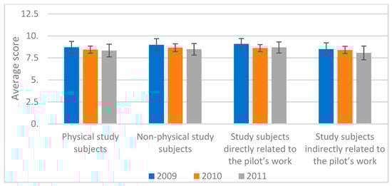 The analyses of the differences between physical and non-physical study subjects and those directly and indirectly related to the pilot’s work revealed no statistically significant difference between the physical and non-physical subjects. However, when comparing the assessment results of the subjects directly related to the pilot’s work with those of the subjects indirectly related to the pilot’s occupation, it was found that the assessment results of subjects directly related to the pilot’s work were statistically significantly higher for students who chose the pilot’s profession after graduation (Mann–Whitney U 710.5, p = 0.000).