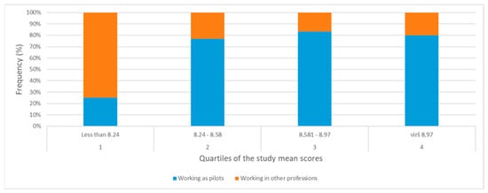 The mean scores of the studies of the graduates working as pilots varied [7.83:9.93]. Four study quartiles were identified. Employment rates according to the quartiles of the mean study scores are presented in Figure 6.