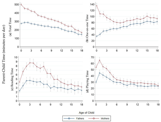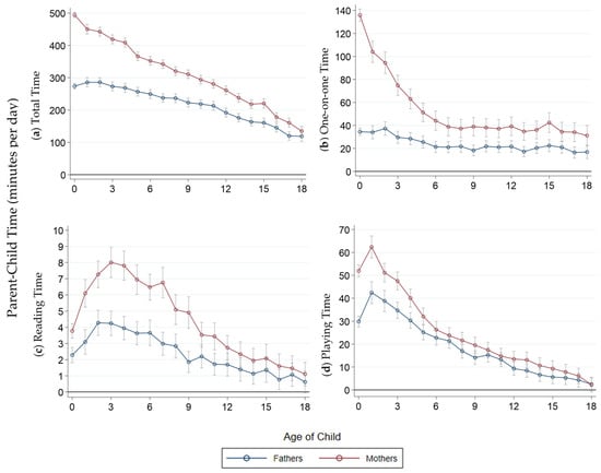 This study evaluated the changes in mothers’ and fathers’ time with their children from infancy to age 18. We aimed to answer two research questions. How much time do mothers and fathers spend with their children from infancy to age 18 (Q1)? How do mothers and fathers differ in their time investments in children from infancy to age 18 (Q2)? Although extensive research suggests that parent time impacts children’s outcomes and that the needs of children change according to developmental progress, no prior research has evaluated patterns of parental time investments across the full span of childhood and adolescence. This study provides new insights by highlighting the value of children’s ages as a key contextual factor in mothers’ and fathers’ contributions to child development across multiple domains. Building on prior research, this study leverages a large, nationally representative sample to assess a range of parent-child interactions over the span of childhood and adolescence. It employs a flexible functional form with minimal restrictions to evaluate these patterns. Understanding how parents spend time with their children at different ages contributes to a deepened understanding of how a child’s age shapes the parental processes governing the intergenerational transmission of skills and human capital to children. Ethical review and approval were waived for this study due to the study being deemed exempt by the Institutional Review Board of Brigham Young University (protocol code 2021-110).