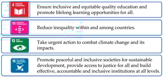Definitions of SDGs 4, 10, 13, and 16. Source: adapted from https://sdgs.un.org/goals (accessed on 13 February 2023).