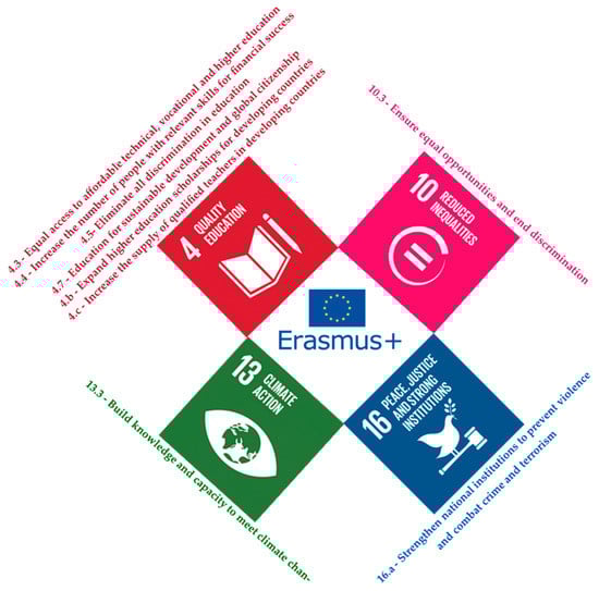 Analysing the information available on the targets, means of implementation, and indicators of SDGs 4, 10, 13, and 16, our conclusion was that not all are relevant or related to the Erasmus+ Programme’s objectives. Therefore, the relevant targets and means of implementation selected were as follows: for SDG 4—4.3, 4.4, 4.5, 4.7, 4.b, and 4.c; for SDG 10—10.3; for SDG 13—13.3; and for SDG 16—16.a (see Figure 2).