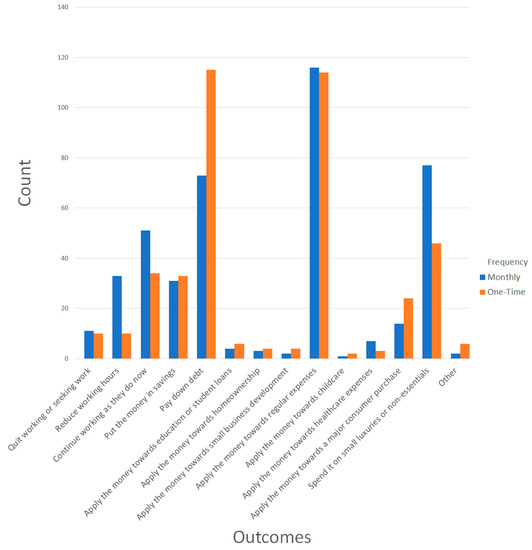 Since some response options were selected less frequently than others regardless of cash transfer plan, outcomes were collapsed into theoretically similar categories and compared once more with benefit frequency. Specifically, new categories were created for quitting or reducing work hours (outcomes A and B), saving or investing the money (outcomes D, F, G, and H), paying off debt (outcome E), spending on necessities (outcomes I, J, and K), and spending on major or minor consumer purchases (outcomes L and M). If participants had responded in the affirmative to any of these outcomes, they were added to the associated response class.