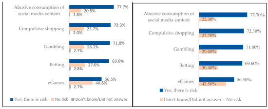 As can be seen in Figure 1, all the activities analysed are perceived as dangerous by the majority of the research subjects, which corroborates the first hypothesis (H1) of this work. However, around 30% of young people either do not answer or do not perceive any risk in activities such as online gambling and online betting, and 43.5% do not answer or do not perceive risk or danger in eGames (Figure 1).