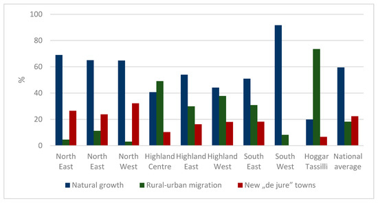 What kind of processes can we find in the background of this regionally uneven urban development? As earlier mentioned, urban growth is influenced by various factors such as natural growth, rural-urban migration, the growing number of “de jure” towns, and integrated rural settlements resulting from urban sprawl. Although only three categories can be distinguished due to the data structure in our empirical research, natural growth emerged as the dominant contributor to urban growth in both decades. Rural-urban migration, on the other hand, was found to have a substantial impact in the Highland Centre and in the Hoggar-Tassili region during the first decade (Figure 2 and Figure 3).