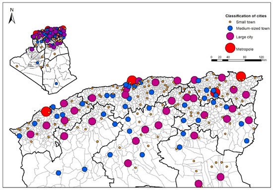 However, how is “urban” defined in Algeria? According to Act 06-06 (2006), a concentration is defined as urban if it has an agglomerated population of at least 5000 inhabitants. According to article number 4 of the above act, any urban concentration with a minimum population and administrative, economic, social, and cultural functions can be considered a “city.” Act 01-20 (2001) links the definition of urban settlements with regional planning and sustainability. In doing so, the act introduces a range of conceptual definitions, including metropole, metropolitan area, big city, new city, and sensitive urban zone. On the other hand, Act 06-06 (2006) defines the concepts of a medium-sized city, small town, and urban concentration (Table 3) and indicates in article number 5 that cities can also be classified based on their functions and influence on the local, regional, national and international level, as well as on their historical, cultural and architectural heritage.