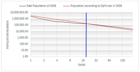 Size distribution of urban settlements compared to Zipf’s law in 2008; edited by the authors based on the data of the relevant census.