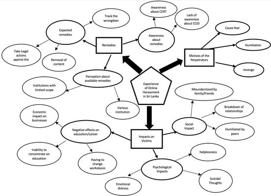 Sri Lankans experience both sexual and non-sexual types of online harassment within which various subcategories could be identified, although many of the incidents were sexual harassment. The analysis also revealed that females were the most vulnerable to online harassment, in line with global trends. More pertinently, the study revealed three global themes: the motives of the perpetrators, the impact on the victims, and remedies. Revenge, humiliation, and extorting demands by causing fear were the organising themes under the first global theme of “perpetrator’s motive”. Moreover, these motives could be identified as closely connected to the impact of online harassment from the viewpoint of the victim. It was recognised that the victim could suffer from psychological, social, and economic harm, in turn identifying them as organising themes within the global theme of “impact”. Psychological harm could be seen in terms of helplessness, emotional distress, and suicidal thoughts, whereas social harm appeared in terms of humiliation by peers, misunderstanding created among family and relatives, and broken relationships. These were the surface-level basic themes that emerged under previously identified organising themes. Additionally, effects on the education, career, and goodwill of the business were the basic themes recognised under the third organising theme “economic harm”. Finally, the third global theme identified remedies expected by the victims, their awareness of remedies, and their perceptions of remedies as the three organising themes thereunder. The victims take interest in seeking redress to remove the harmful online content, tracking the perpetrator if unknown, and taking legal actions against them. These were the basic themes that emerged under the organising theme of expected remedies. According to the analysis, the participants lacked awareness of the role of the CERT and lacked overall awareness about the CCID, which were identified as basic themes under the organising theme “awareness of remedies”. The organising theme “perception on remedies” identified the existence of various institutions and their limited capacity as the underlying basic themes. As such, thematic analysis contributed to a graphical and clear understanding of the factors linked to online harassment in Sri Lanka and their interrelatedness.