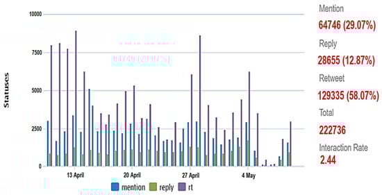 The discussion trend regarding LSSR shows a high engagement from the public since the policy was first enacted in DKI Jakarta, the province with the highest number of positive COVID-19 cases in Indonesia. The following figure shows the engagement dynamics throughout data collection, covering interactions in mentions, retweets, and replies. The data shows that LSSR implementation is an issue that is regarded as necessary since there is daily information or mentions in regards to LSSR, as well as public response in the forms of retweets or hashtags that are related to LSSR. The tendency of response to come in the form of retweets to continue the messages shows that the messages contain essential meaning for the public or have informative value, so that there is relevance between the messages and public needs.