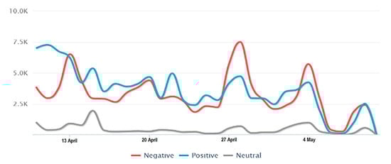 Figure 2 shows that the trend in sentiment indicates an almost balanced response between positive (50 percent) and negative (44 percent) responses. The Figure 3 below shows that negative responses rose several times, exceeding positive and neutral responses, that is, on 13 April 2020 (6504 negative mentions), 28 April 2020 (7497 negative mentions), and 4 May 2020 (5708 negative mentions). Such statements with a negative tone contain the public’s criticism of the weakness of LSSR enforcement throughout the implementation of LSSR and doubts about the effectiveness of LSSR implementation.