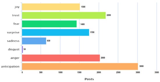 The tendency of negative responses that continue to fill discussions on Twitter for a month since the enactment of LSSR is confirmed in the analysis of public emotion tendency reflected in posted tweets. Figure 4 shows the highest tendency in statements containing anticipatory messages (3017 mentions). Anticipatory messages contain statements on the government’s efforts in LSSR implementation or situation updates, which are mainly informative. Data also showed that statements that reflect trust and anger also rank high.