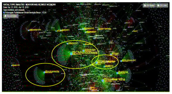 These negative sentiments accounts did not show an interrelation with one another, indicating that their messages were different but contained negative sentiments equally. For example, the account @wanderstruck posted a message with information on the condition of Semarang Zoo, which had difficulties being in a Red Zone that implemented LSSR, resulting in difficulties for feeding the zoo animals after the closing of the zoo during LSSR (https://twitter.com/wanderstruck__/status/1257080327249342464, accessed on 19 May 2020). Several other accounts with negative tones contained other messages, such as criticism of political figures who used LSSR as a pretext to avoid investigations by the police. Overall, the messages with negative tones were not related to each other but garnered a high engagement which exceeded the number of positive sentiments whose contents were directly related to the implementation of LSSR.