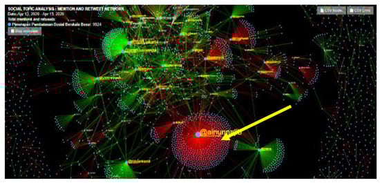 The following social network analysis map is regarding 13 April 2020, marked by many tweets with negative sentiments. The negative sentiments that gained strength in Twitter discussions were triggered by tweets from the account @ainunnajib that contained criticism against the Health Minister who refused to give authorization for the Palangkaraya Municipal Government to enact LSSR, reasoning that COVID-19 had not reached a critical level in Palangkaraya, even though the purpose of LSSR is to control infection so that there would not be a critical level (https://twitter.com/ainunnajib/status/1249490191074471936, accessed on 18 May 2020). This tweet is coupled with the corresponding document from the Minister of Health. Since being posted at 07:30 a.m., this tweet garnered an increasing engagement which peaked at 11:59 a.m., as seen in the Figure 6.