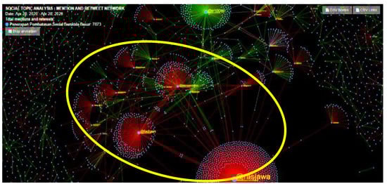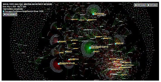 The account @ridwankamil, which created a rather large cluster at the center of the discussion, posted a status that contained information on pickup services from the West Java government for West Java residents then waiting in Saudi Arabia. These West Java residents then underwent a period of isolation per COVID-19 health protocol (https://twitter.com/ridwankamil/status/1257207671981248513, accessed on 19 May 2020). The account of @ridwankamil is the personal account of the West Java governor, who is regularly active on Twitter, not only during the duration of the COVID-19 pandemic.