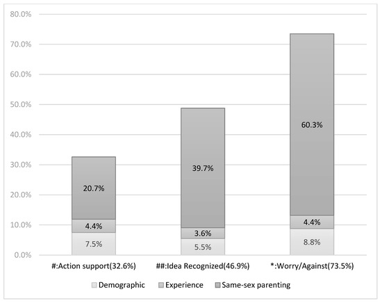 Figure 1 shows the summary of Table 8, Table 9 and Table 10. The three same-sex dimensions are predicted by Block 1: demographic variables; Block 2: experiences; and Block 3: same-sex parenting. The three dimensions of same-sex adoption: “Action Support”, “Idea Recognition”, and “Worry/Against” are predicted by the independent variables of Block 1, 2, and 3, respectively, and 32.6% (Table 10), 46.9% (Table 9), and 73.5% (Table 8) of the variation are explained, respectively.