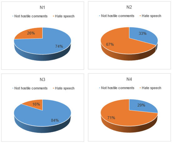Of the total number comments that we analysed, 60 of them—one in ten—were considered examples of hate speech because they expressed discriminatory, hostile or violent messages against LGBTQI+ people. This occurred among those comments that believed the content of the publications published on the Mediterráneo Digital Twitter profile were true. If we look at only this type of message (those that believed the pseudo-news contained in the posts was true), the percentage of messages that we categorised as hate speech increased to 25.2%—one in four. As can be seen in Figure 2, the presence of hate speech is inversely proportional to the publication of comments by the social audience. In other words, in those publications that did not receive many comments, N2 and N4, the most prevalent reaction among users who seemed to believe the fake news was hate speech. In the two pieces that had a much higher reaction from Twitter users, N1 and N3, the percentage of hate speech of the total amount of opinions that believed the messages was significantly lower.