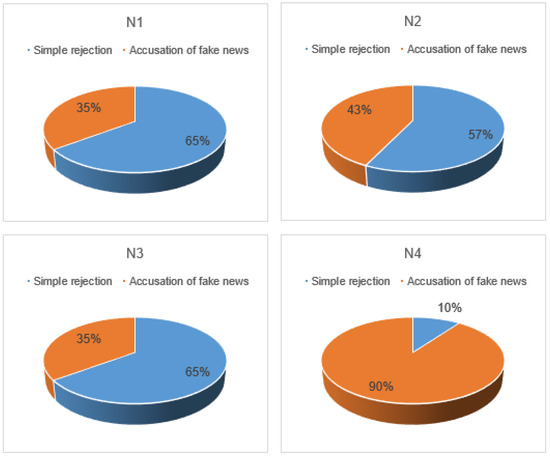 Categorising the comments to each piece allows us to highlight certain differences. The audience’s reaction to both N1 and N2 follows the general dynamics, and therefore, comments that believed the pseudo-information was true predominate, since they represent 46.2% (123) (N1) and 40% (12) (N2) of the total comments that accompany these publications (compared to 24.8% (66) and 23.3% (7), respectively, of messages that seek to reject the news pieces). Here are two examples of the comments: “Are we all turning into idiots?? Who does this supposed equality benefit? Why should rights be taken away from me to give to only a handful of other people? I will continue to celebrate Mother’s and Father’s Day, whether the government likes it or not!!!” and “We must stop this totalitarian delusion. This government must be thrown out. I am so offended I feel sick”, both expressed by users who commented on N1. In the case of N3 and N4, the majority of the comments refuted the pseudo-information. In the first case, they represented 39.3% (108) of the total comments (compared to 34.9%–96 who believed it), while in N4, 40% (10) of the opinions rejected the message (compared to 28%–7). The comments that refuted the veracity of the information pointed out that, in reality, the Pride celebration “is online” (N3) or described the publication as “junk journalism” (N4).