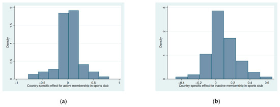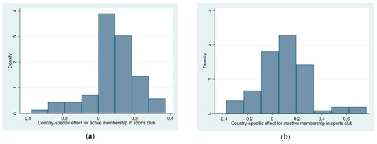 The random effects and of being an active (or inactive) member are also independently and identically normal-distributed, meaning that ~ N (0, and ~ N (0, ) holds. Furthermore, it should be noted that all random effects are modelled as independent from each other which helped to reduce the computational burden of these models. After calculating Model 3—the one that includes the average effect and the random effect for active and inactive membership in sports clubs—I estimated the country-specific effects of active and inactive membership in sports clubs on gender ideologies by calculating the sum of the average effect and the country-specific posterior means of the random effects. After calculating the country-specific effects, I analyzed the between-country variation in the effect sizes of active and inactive membership in sports clubs by inspecting the distribution of the country-specific effects.