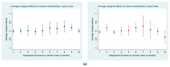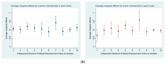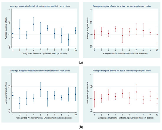 Average marginal effects for active and inactive membership in sports clubs (a) conditioned on the deciles of the Exclusion by Gender Index or (b) conditioned on the deciles of the Women’s Political Empowerment Index for the group of women. We included 95% confidence intervals using robust standard errors. Source: WVS-EVS data and V-Dem data.