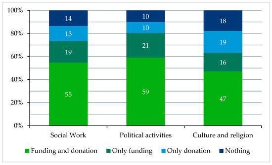 H1 is also confirmed when it comes to the share of MOs which get funding (Figure 1). While 55% of MOs with social work as focal point and 59% of politically active MOs get both funding and donation, this share is lower for MOs specializing in cultural and religious activities with just 47%.33 The share of cultural and religious active MOs that only get funding (without donation) is 16%, which is also slightly lower than that of MOs offering social (19%) and political work (21%). Only the share of organizations that profit from donation is higher for MOs with cultural/religious activities than for the other two activity fields. This can probably be explained by the fact that donation is particularly important for the work of religious migrant organizations (Ceylan and Kiefer 2016, p. 85). If we look to the number of MOs that receive funding or donations separately, a strong difference between activity fields only exists for funding, while the difference for those that only receive donations is comparatively lower. While 80% of politically active MOs get funding, only 63% of MOs with an emphasis on culture and religion do. MOs that offer social work are in between with 73%. The differences regarding donation are much lower with values of 66% (culture and religion); 68% (social work); and 69% (political activities). Overall, H1 can be confirmed. However, a difference between political and social activities was found, in that the former have more resources overall than the latter.
