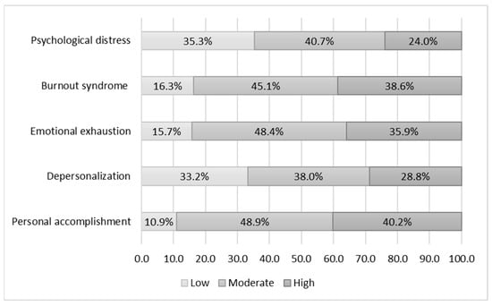 According to Figure 1, the level of psychological distress of 40.7% of the teachers was moderate, 35.3% was low, and 24% was high. These results indicate that the teachers showed feelings of sadness, uncertainty, confusion, worry, and hopelessness upon returning to face-to-face classes. On the other hand, it was found that 45.1% of the teachers presented a moderate level of burnout syndrome, 38.6% had a high level, and 16.3% had a low level, which indicated that teachers showed significant decreases in their energy and emotional resources, caused mainly by the presence of various stressors in the educational context. In the emotional exhaustion, depersonalization, and personal accomplishment dimensions, the moderate level predominated.