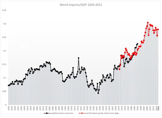 Weighted Average Openness Imports Globalization, 1830–1995 and World Imports/GDP 1972–2021; Sources: Chase-Dunn et al. (2000); World Bank (2023).