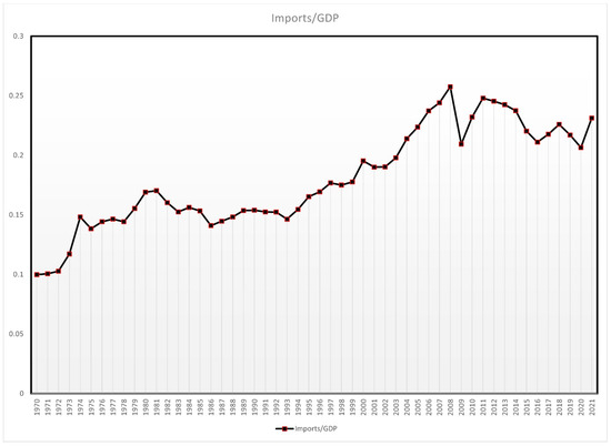 Import Globalization 1970–2021: World Imports as a Percentage of World GDP; Source: World Bank (2023).