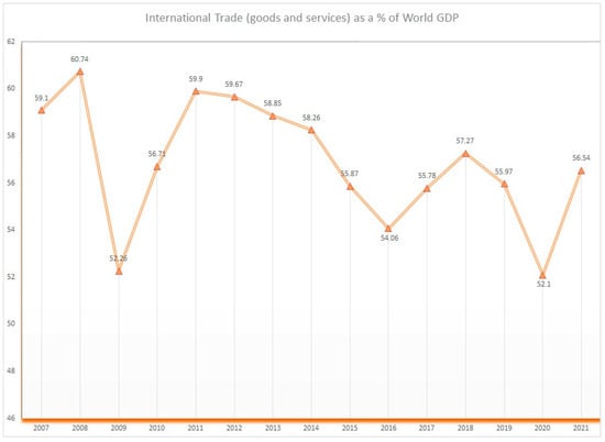 Total international trade as a percentage of global GDP, 2007–2021. Source: World Bank World Development Indicators, Series Code: NE.TRD.GNFS.ZS.
